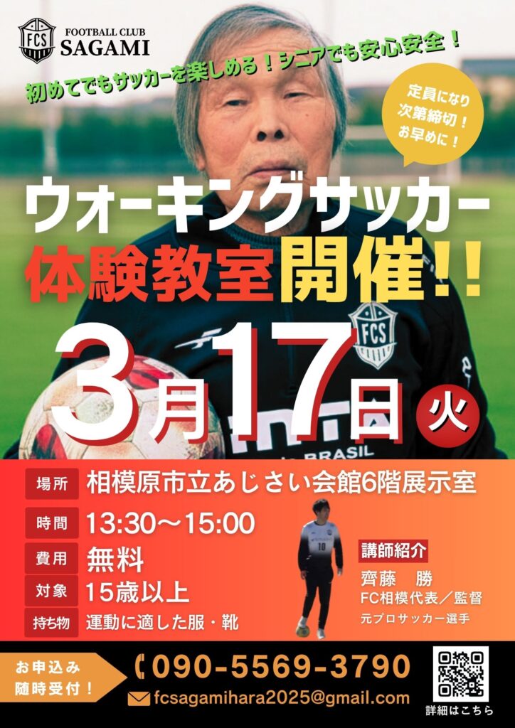 FC相模は、相模原市立あじさい会館様と連結し、地域社会の健康増進と高齢者スポーツの普及を目的とした「ウォーキングサッカー体験教室」を協働開催いたします。
